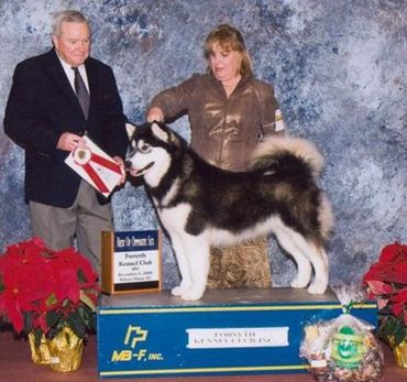 Libby was major pointed out of the puppy classes, and finished at 14 months with 3 major. She is a multiple Breed winner. She has since taken some time off for "Motherhood", which she had exceled at as well. She has produced children who are Specialty Winners, Top area puppies, major pointed puppies.